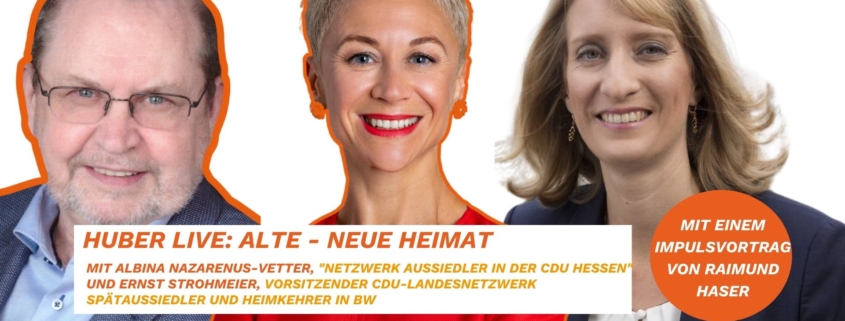 Isabell Huber MdL lädt zu einer Online-Gesprächsrunde mit Albina Nazarenus-Vetter vom „Netzwerk Aussiedler in der CDU Hessen“ (UdV) und Ernst Strohmaier, Vorsitzender des CDU-Landesnetzwerkes Spätaussiedler und Heimkehrer in Baden-Württemberg ein. Gemeinsam tauschen wir uns am 25.02.2021 um 19:00 Uhr über die neue und alte Heimat, die unterschiedlichen Erfahrungen und Themen, die bewegen, aus. Raimund Haser, Beauftragter für Angelegenheiten der Vertriebenen der CDU-Landtagsfraktion wird in einem Impulsvortrag die Arbeit im Land vorstellen. Interessierte können sich unter info@isabell-huber.de anmelden, gerne können hier auch bereits vorab Fragen gestellt werden.