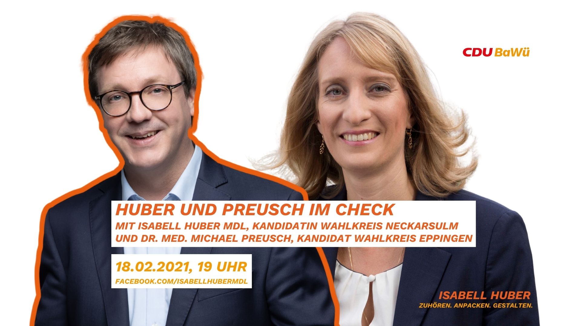Isabell Huber, CDU-Landtagsabgeordnete und -kandidatin im Wahlkreis Neckarsulm im Austausch mit dem CDU-Landtagskandidaten für den Wahlkreis Eppingen, Dr. med. Michael Preusch. Moderiert wird die Veranstaltung von der Jungen Union. Huber und Preusch stellen sich im Rahmen der Huber Live-Veranstaltungen einem Check zu persönlichen und politischen Themen. Seien Sie live dabei unter www.facebook.com/IsabellHuberMdL